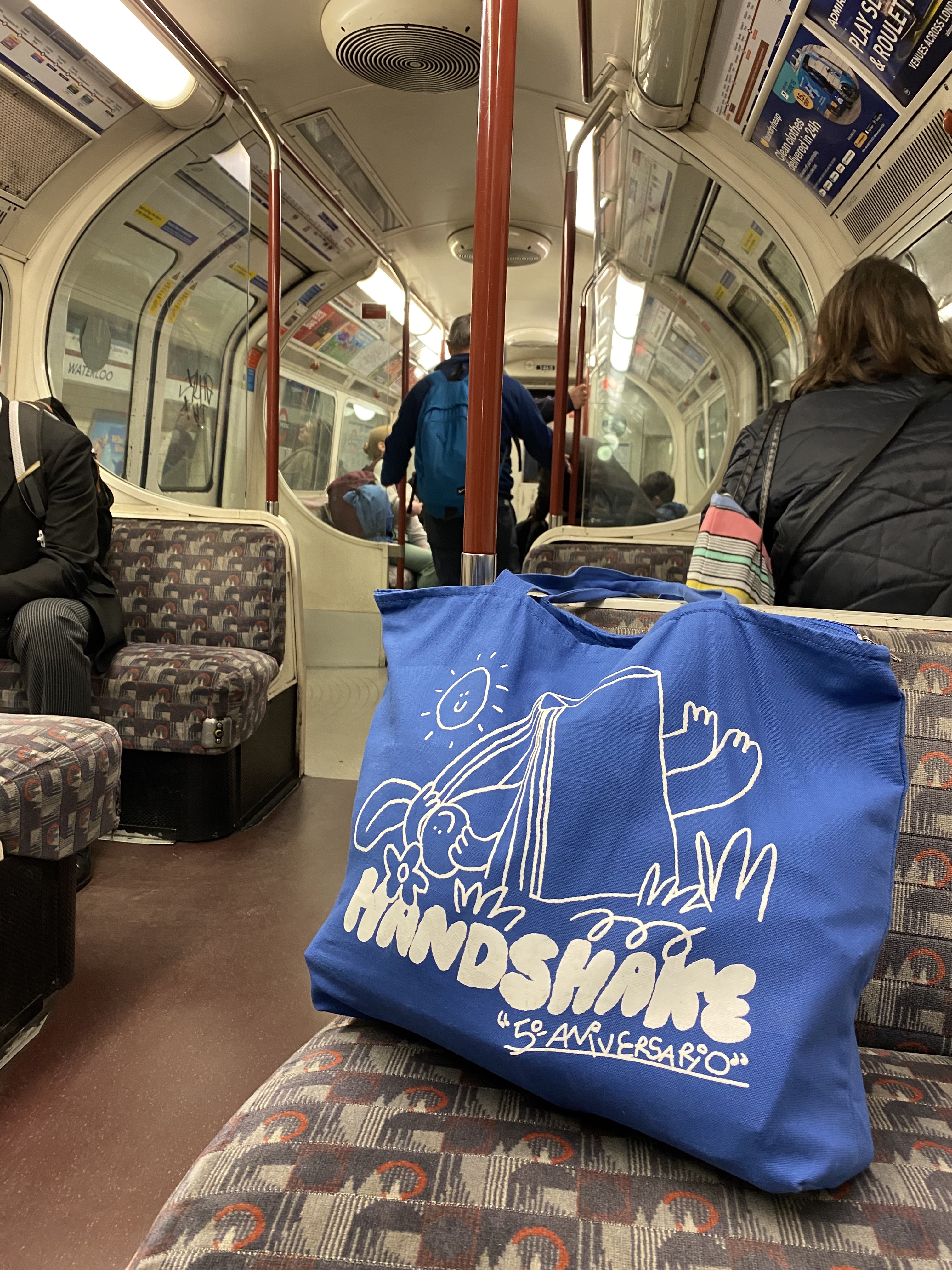 [ENG] Handshake 5th Anniversary tote designed by Cuca Berenguer. Big blue canvas zippered tote bag, screen-printed with white ink. With a full zip top closure and small interior zippered pocket. Durable construction.