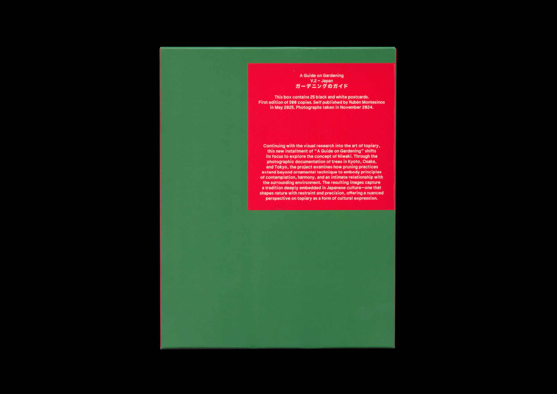 A project by Rubén Montesinos[ENG] Continuing with the visual research into the art of topiary, this new instalment of "A Guide on Gardening" shifts its focus to explore the concept of Niwaki. Through the photographic documentation of trees in Kyoto, Osaka, and Tokyo, the project examines how pruning practices extend beyond ornamental technique to embody principles of contemplation, harmony, and an intimate relationship with the surrounding environment. The resulting images capture a tradition deeply embedded in Japanese culture-one that shapes nature with restraint and precision, offering a nuanced perspective on topiary as a form of cultural expression.