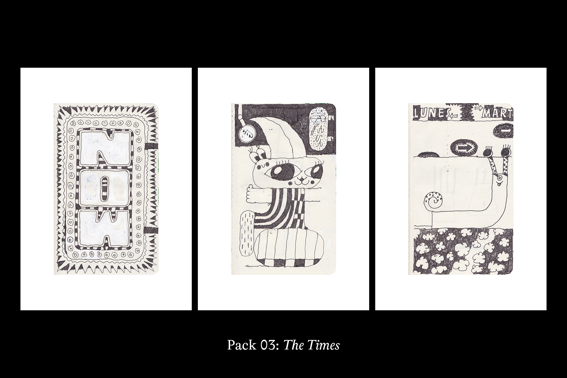 Three different prints pack, limited to 10 copies each, signed and numbered by the artist. Every pack includes a collection of three different drawings: