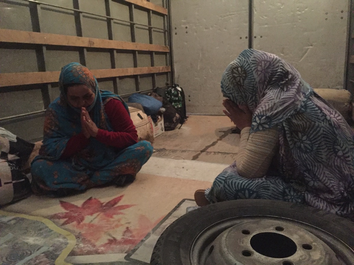 Leila and Nora praying to cross the border into Tunduf, and Nora seconds after veryfing we have entered Tindouf. April 2020.